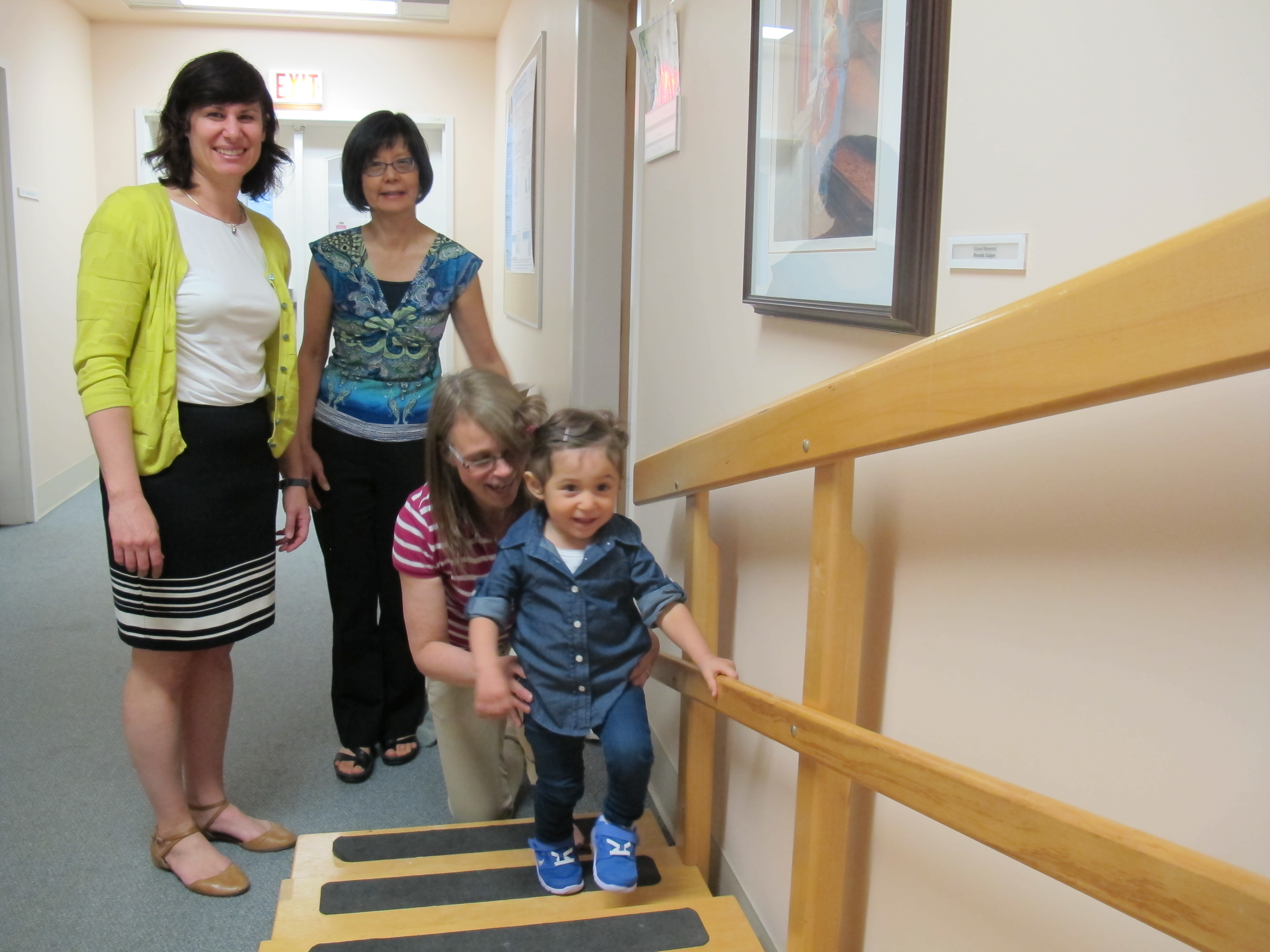 Left to right: Researchers Monica Gorassini and Jaynie Yang observe pilot study participant, Alesandra, walk up some stairs with the help of her physiotherapist, Donna Livingstone.