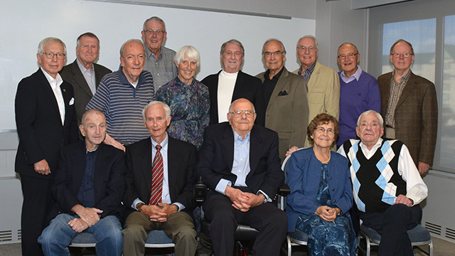 The attendees of the '61 alumni reunion in 2016, left to right. Front row: Tim Myers, Larry Bryan, Harry Afaganis, Madeline McPherson, Fin Fairfield. Middle Row: Dale Birdsell, Bill O'Callaghan, Elizabeth Saltor, Vic Sartor, Nis Schmidt, Ben Ruether, Fred MacDonald, Rod Morgan. Back row: Ray Ulan and Rex Boake.