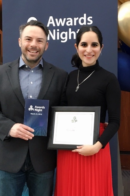 Above: Maryam Kebbe accepts the Martha Piper Award from the Graduate Student Association alongside supervisor Geoff Ball