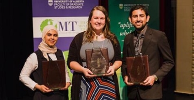 Above: Graduate student Nada Alshumaimeri receives the 3MT UAlberta People's choice award (Photo credit Faculty of Graduate Studies and Research)