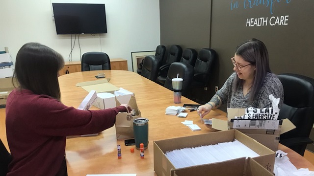Covenant Foundation staff fill envelopes with gift cards from local restaurants as a way to say thank you to medical students helping with COVID-19 contact tracing. (Photo: Tracy Sopkow)