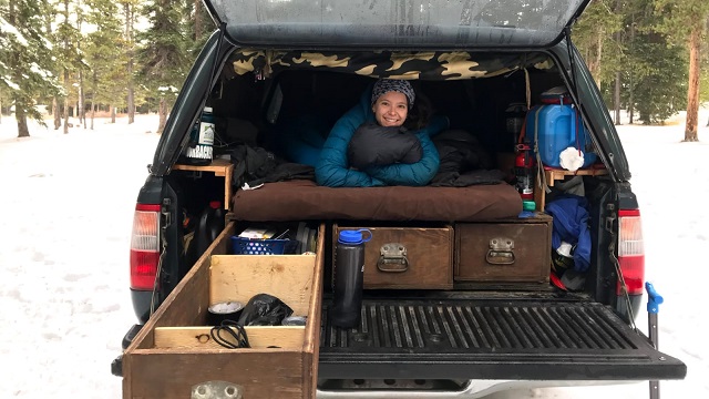It might be a bit of an understatement to say that Liz Cook, '20 MD, loves the outdoors. She skis. She bikes. She rock climbs. She even built a camper on the back of her 1995 Toyota T-100 truck specifically designed to fit her skis, alongside a pullout kitchen complete with sink. The big city is not where you'll find her.