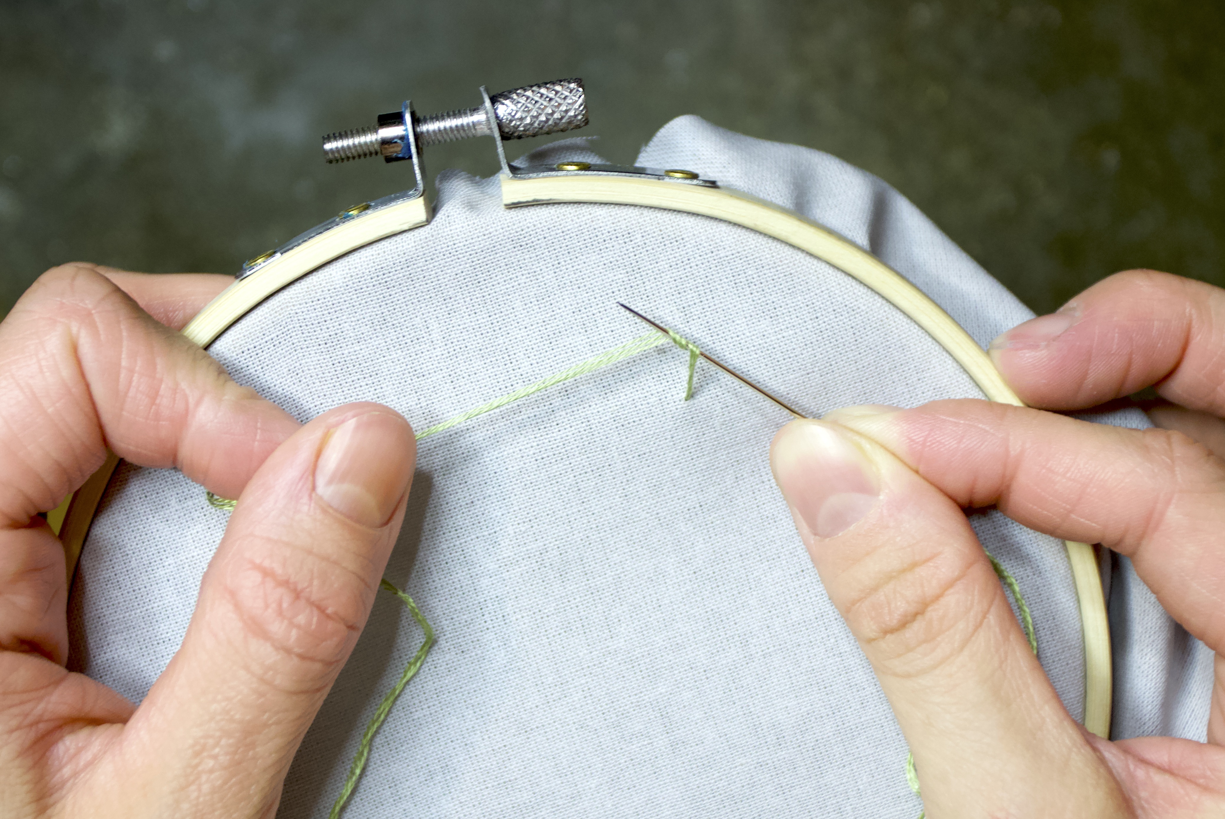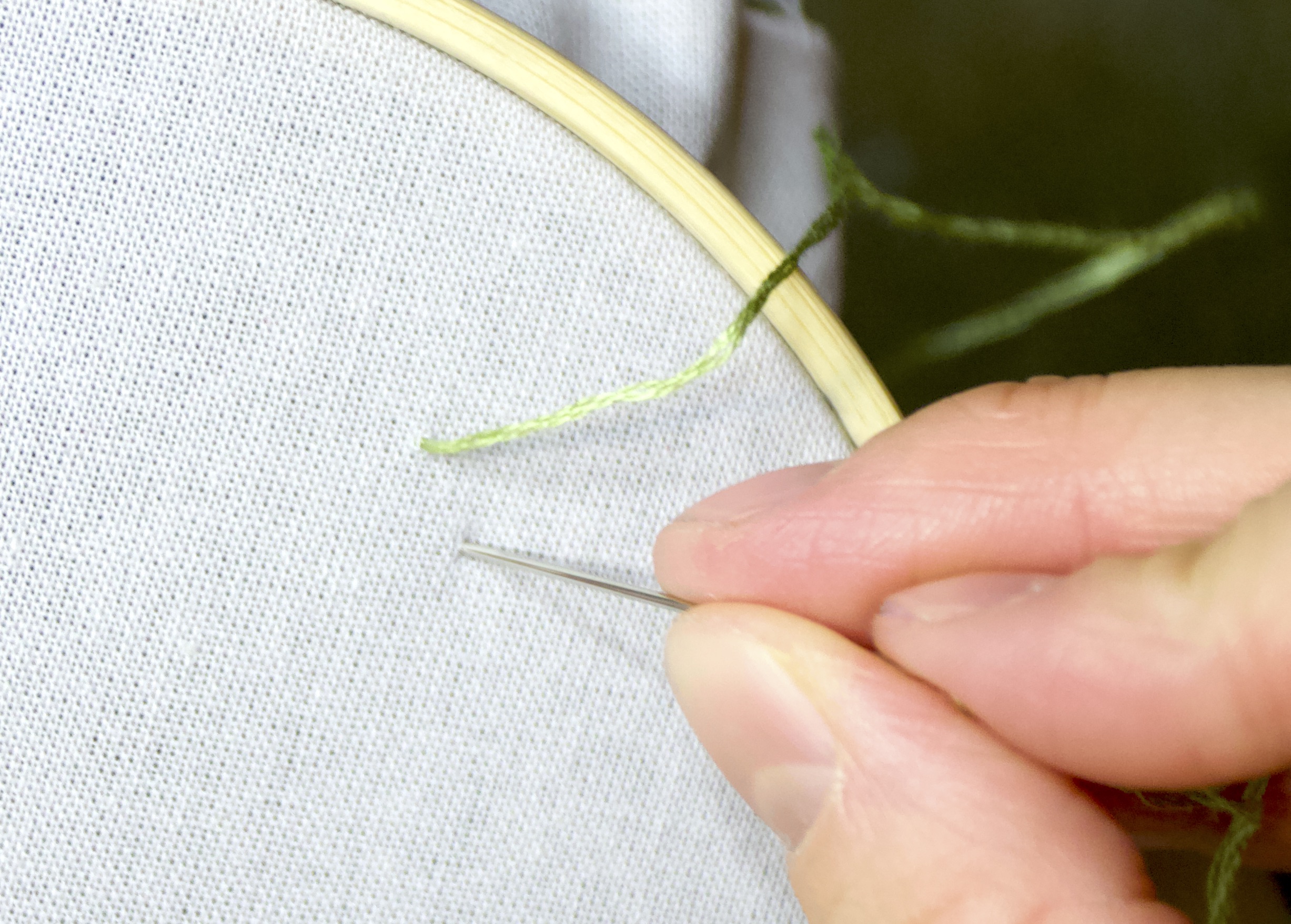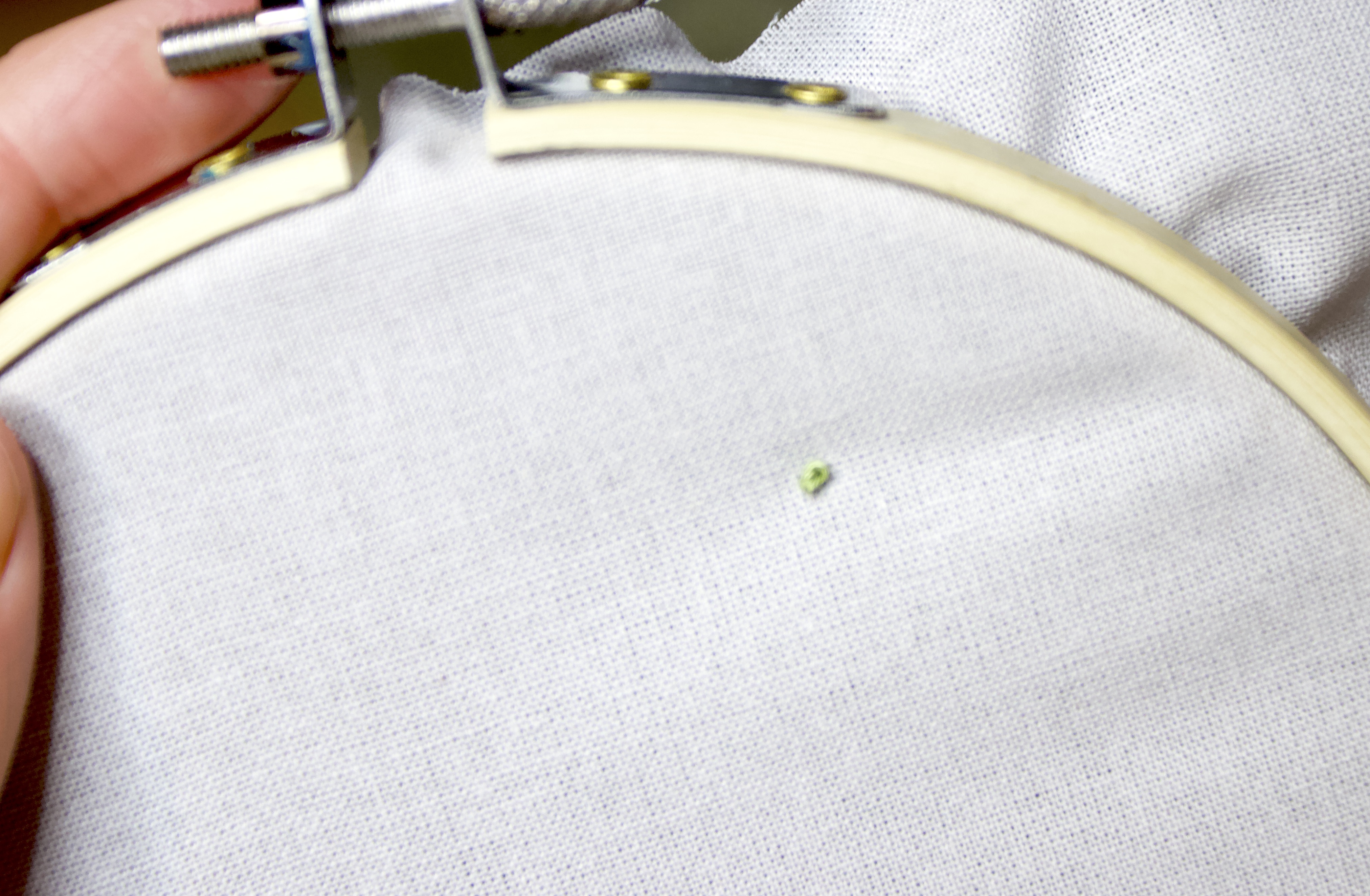 - Take your needle and identify a point ¼” away from the last stitch on the front of your hoop. Pull the needle and thread all the way through the fabric.