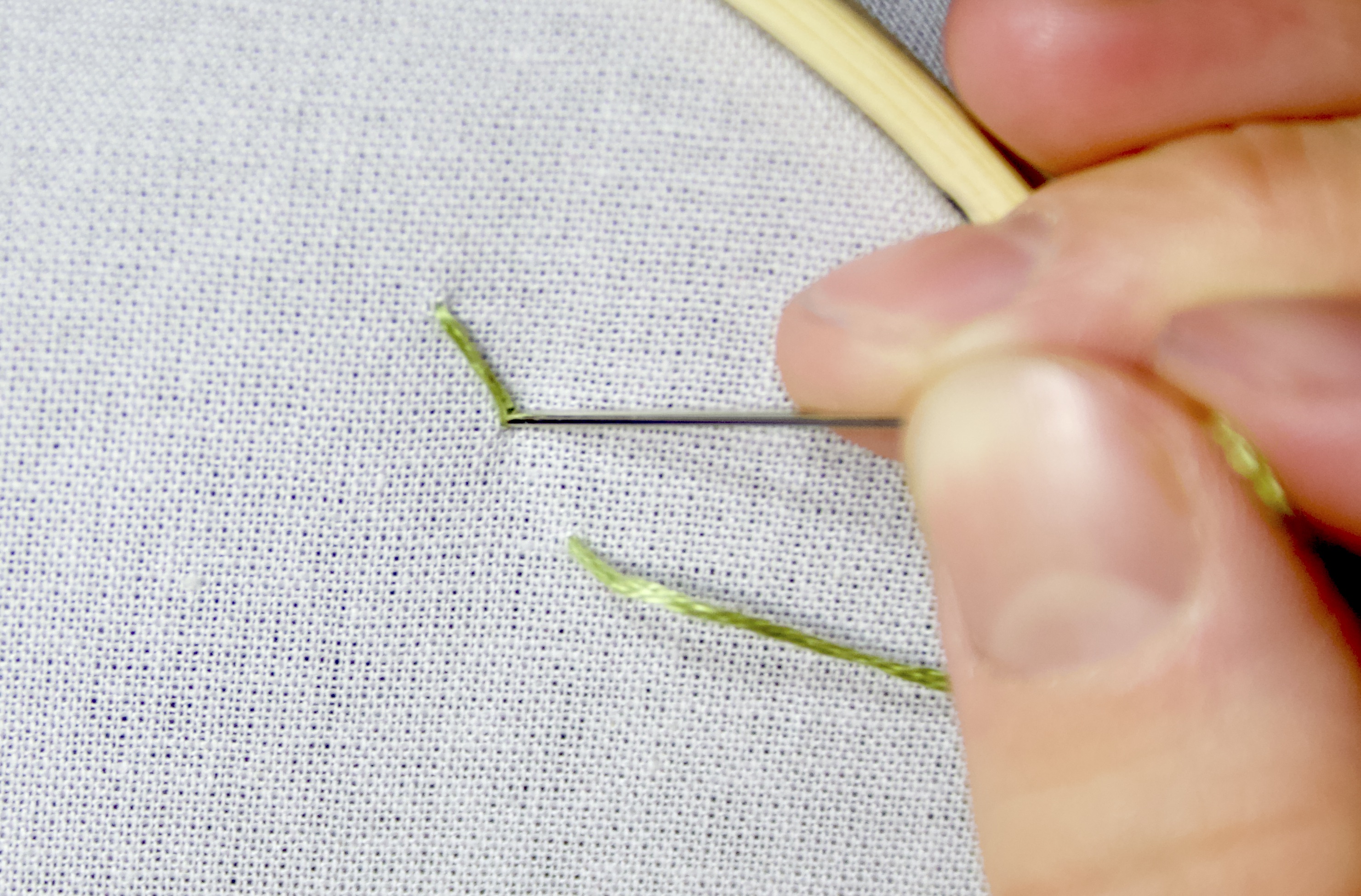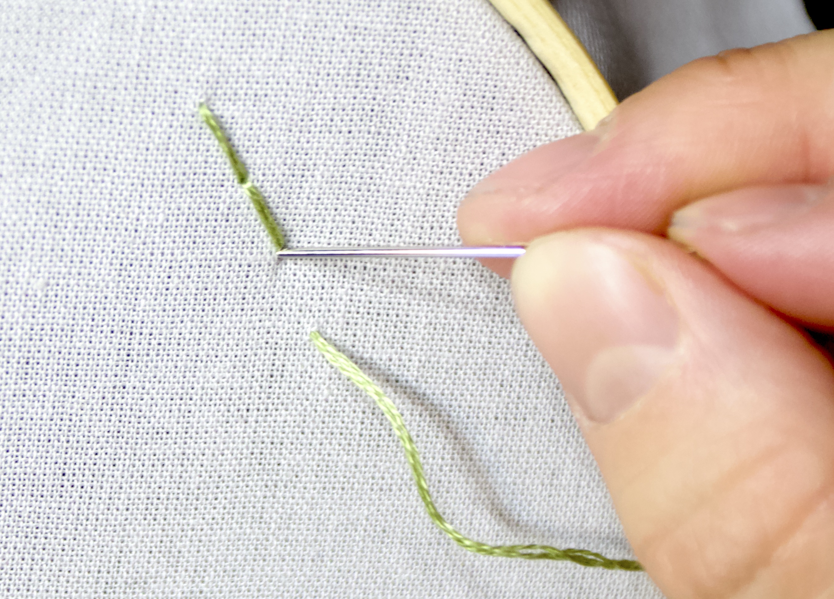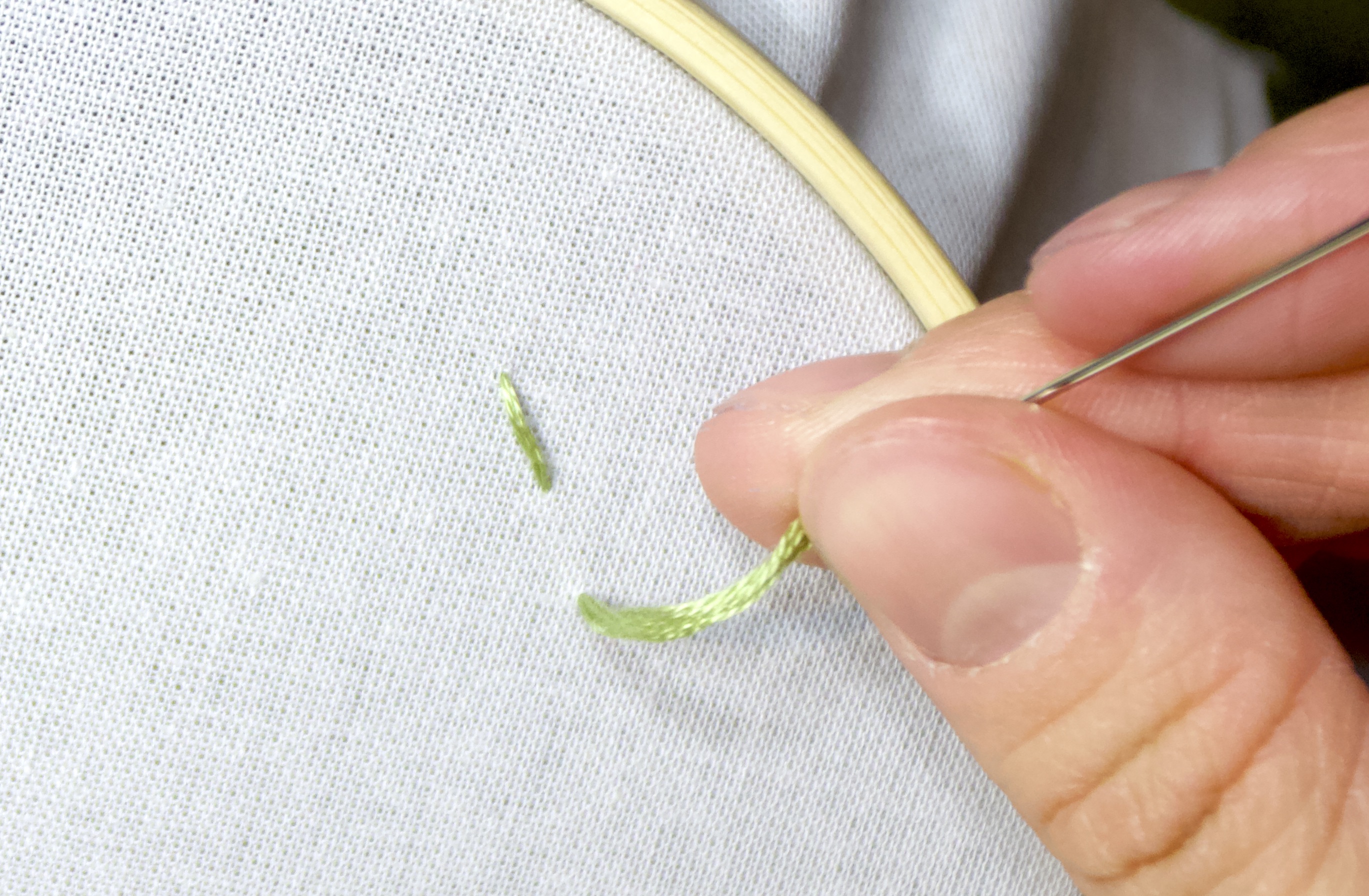 - Continuing to hold tension, push the needle through a point very close to where you came up through the fabric. Pull the needle and the thread all the way through.