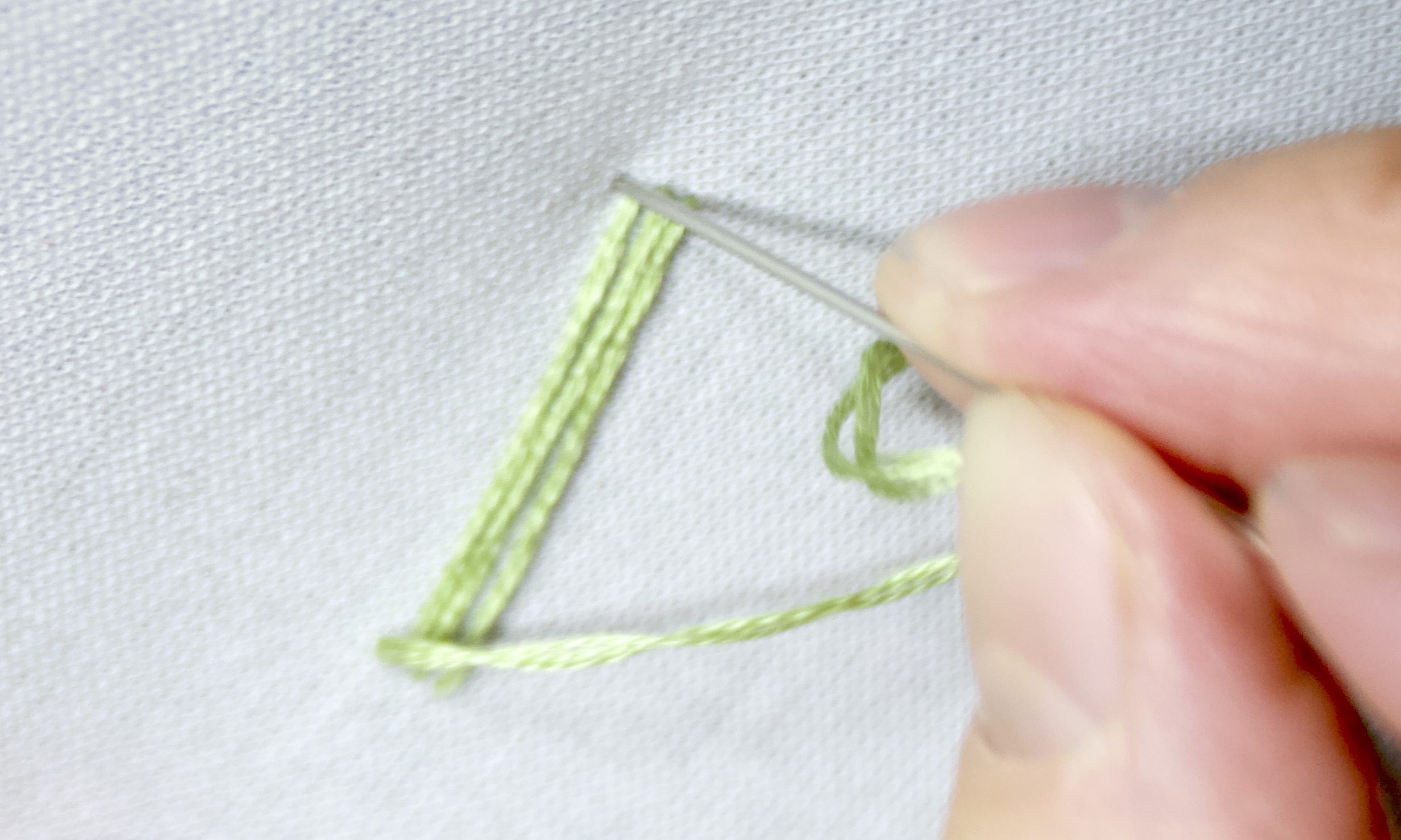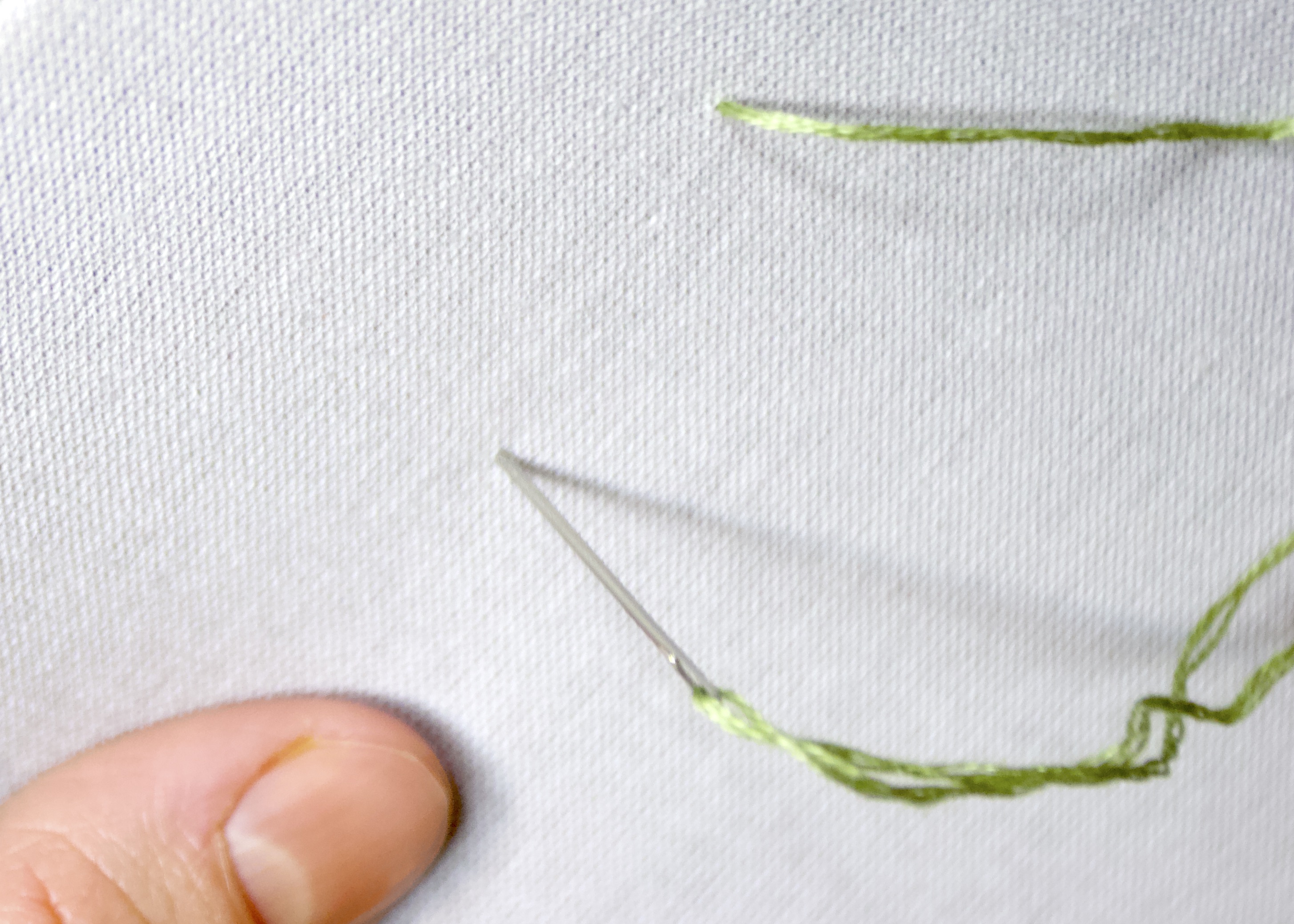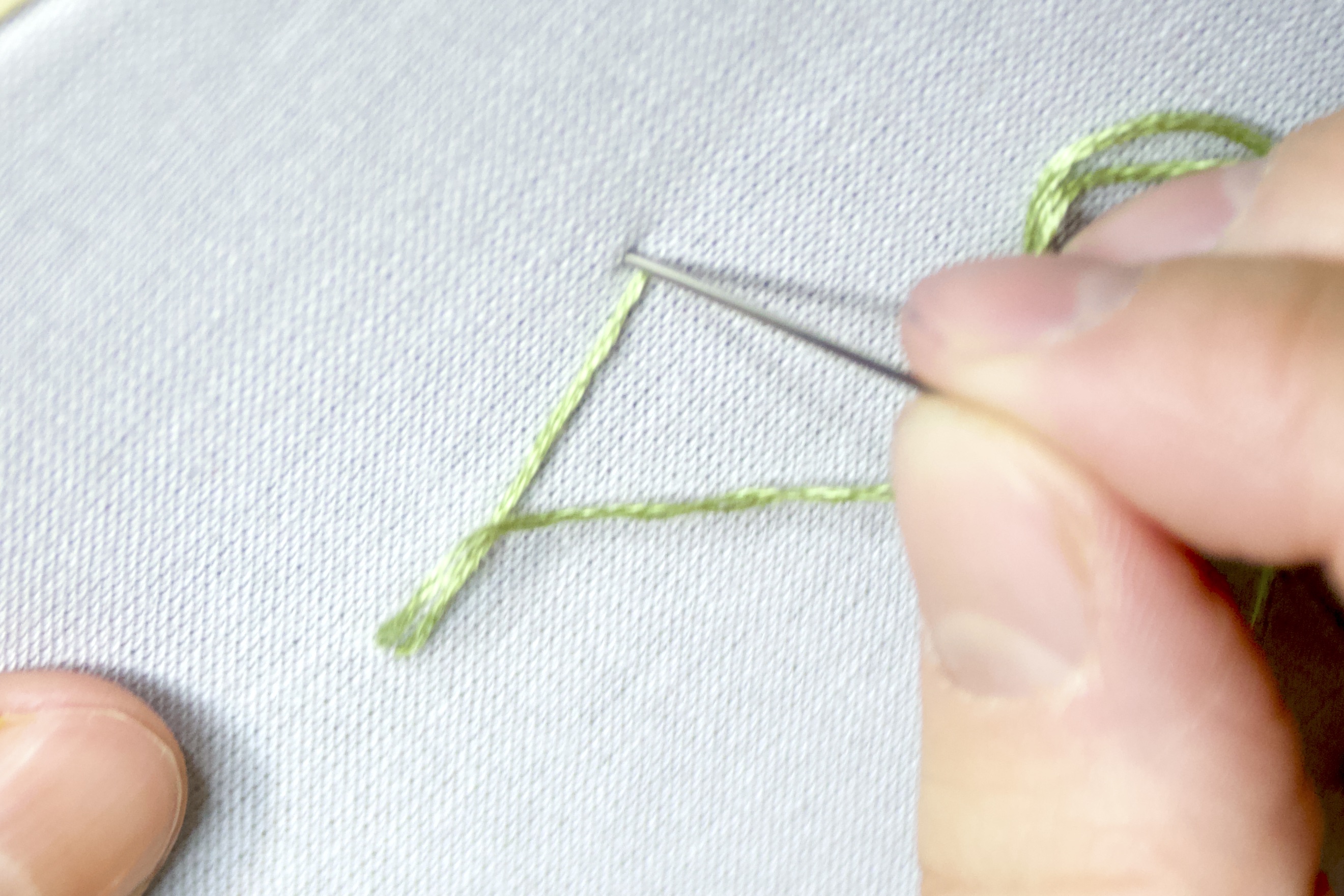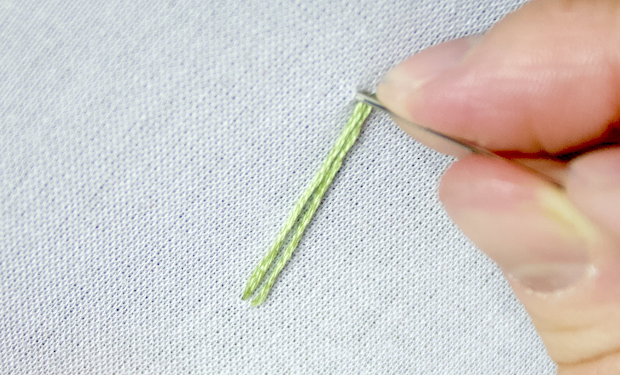 - Continuing to hold tension, push the needle through a point very close to where you came up through the fabric. Pull the needle and the thread all the way through.
