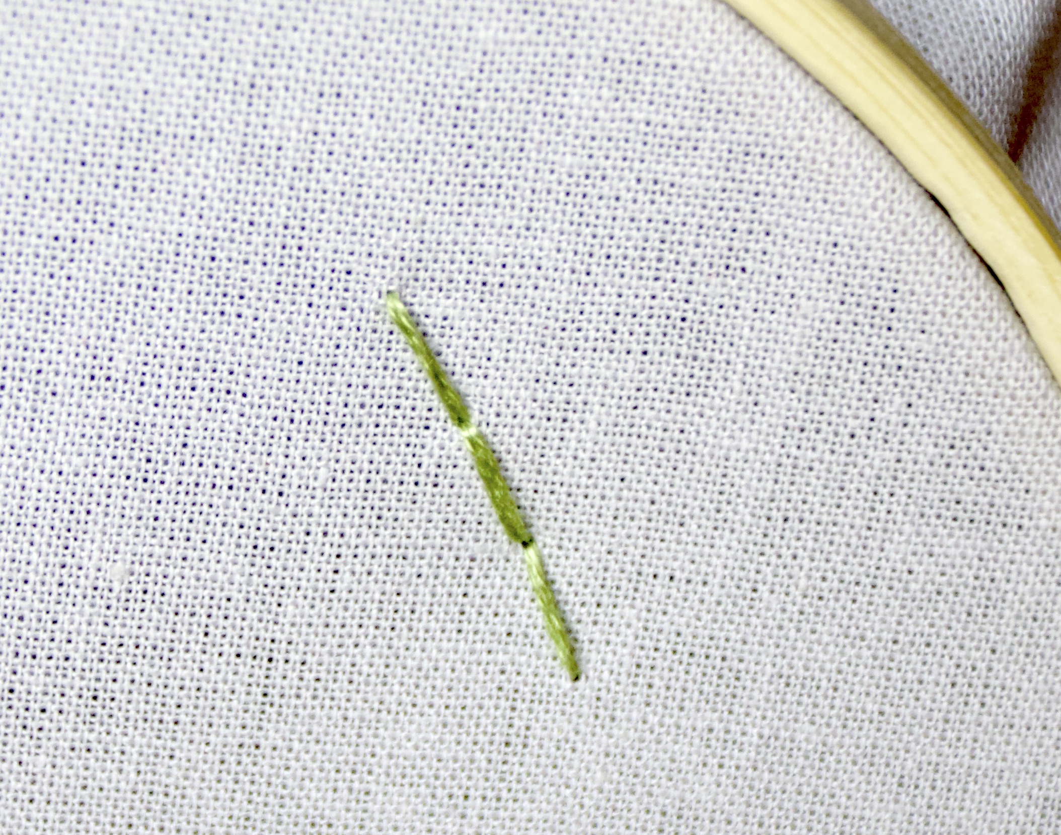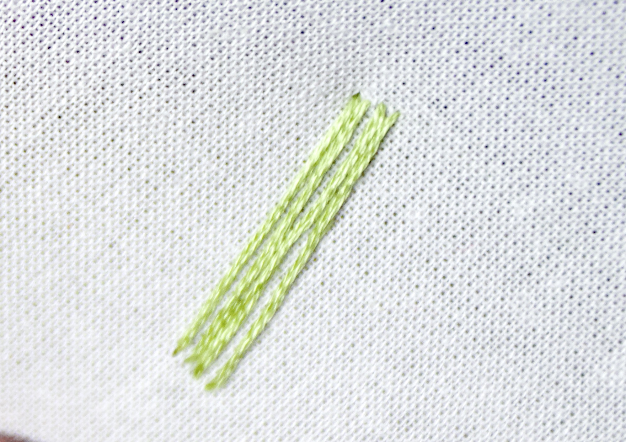 - Position your needle to come back up through the fabric at a point right next to the point you just came through. Pull all the way through. Re-enter your fabric to the backside at a point that is right next to the original opposite point where you started. Pull all the way through.