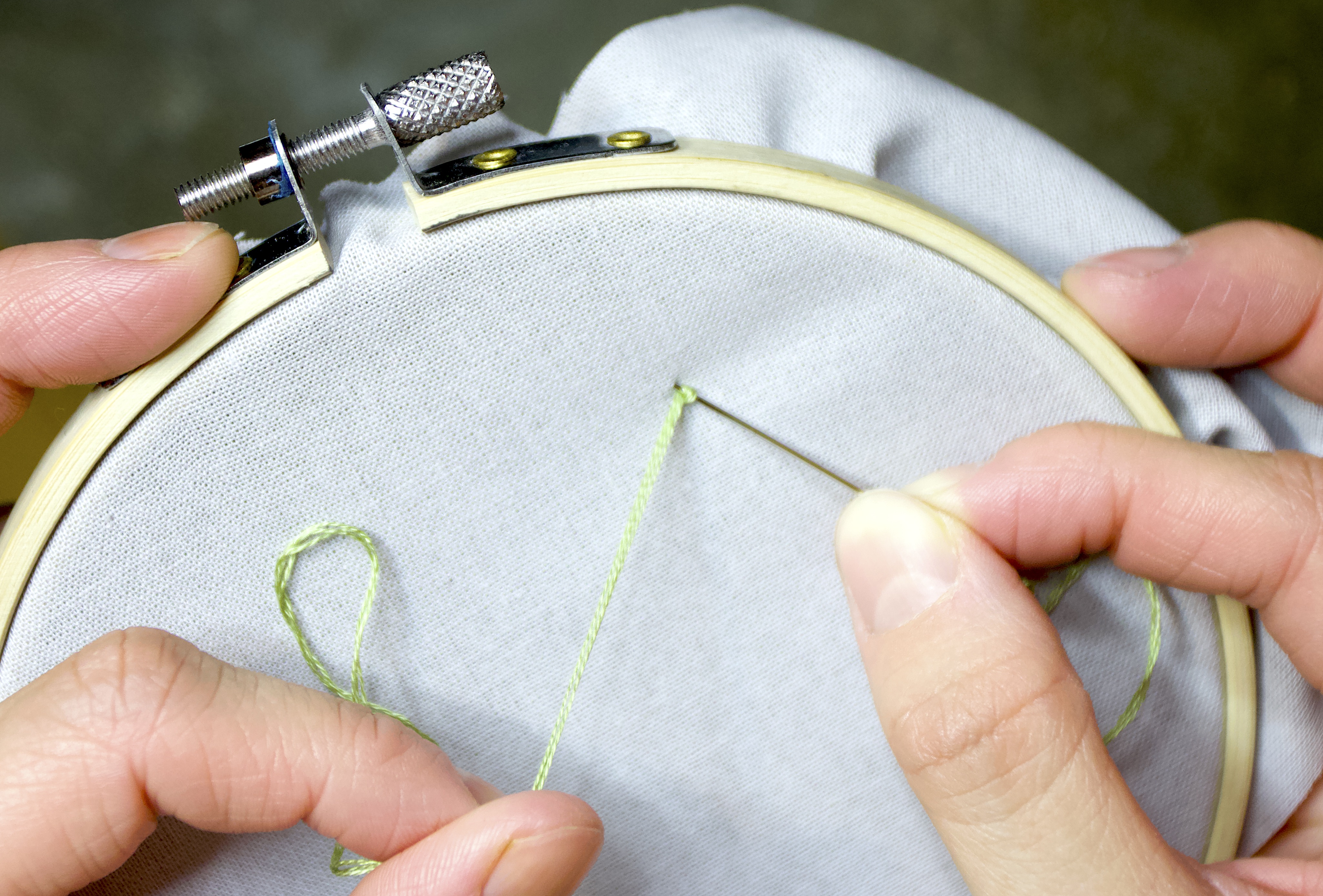 Hoop Tip: A loose screw will cause the fabric to sink and sag as you embroider, which can distort the quality of your stitches. Tighten the exterior hoop as far as it will go and gently tug the corners of your fabric outside the hoop to make sure you have good tension.