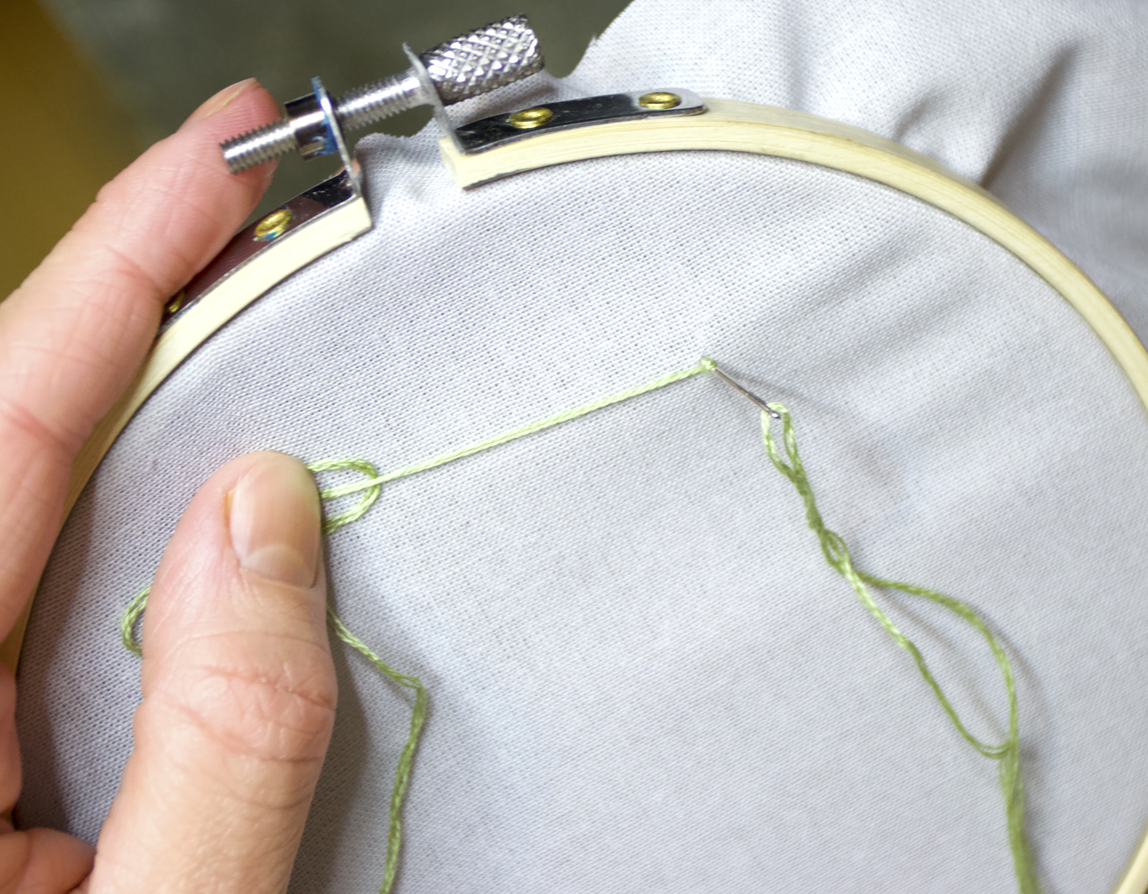 Take your threaded needle and push it through the fabric at a point along your pattern outline. Pull the needle and thread all the way through, so that the knot sits on the backside of the hoop.