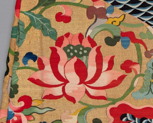 The lotus flower pattern is based on a less detailed woven lotus flower, found on “Gold Silk Tapestry Weave Tibetan Chuba,” (2005.5.253). The lotus flower is an auspicious symbol that holds meaning in both Tibetan and Chinese culture, representing purity and enlightenment.