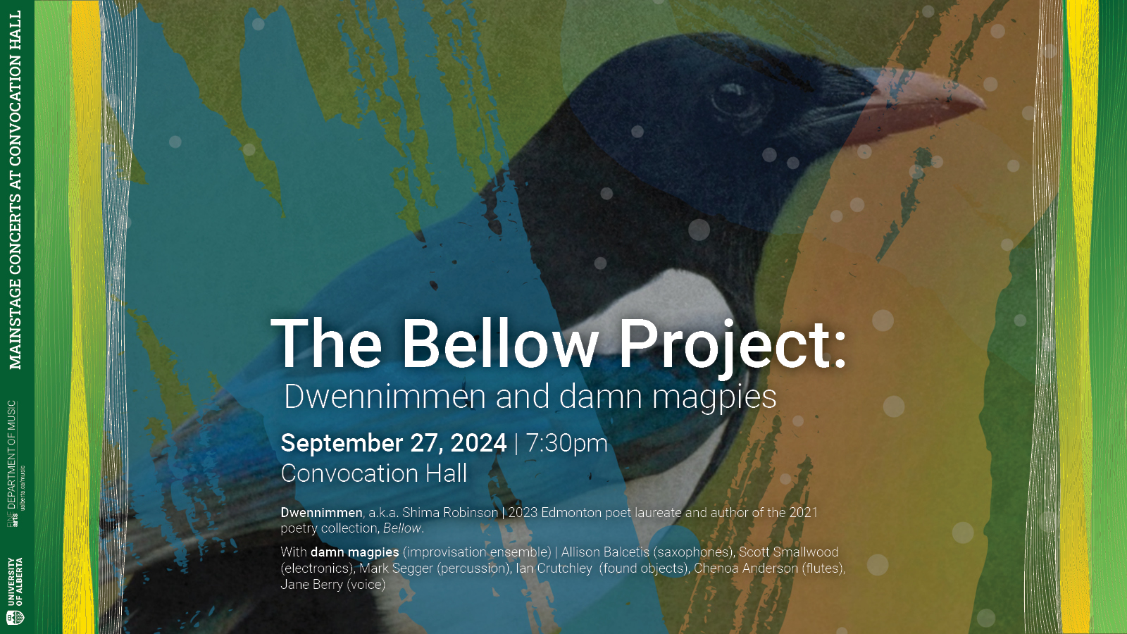 Featuring Dwennimmen, a.k.a. Shima Robinson: 2023 Edmonton poet laureate and author of the 2021 poetry collection, Bellow. With damn magpies (improvisation ensemble): Allison Balcetis (saxophones), Scott Smallwood (electronics), Mark Segger (percussion), Ian Crutchley (found objects), Chenoa Anderson (flutes), Jane Berry (voice)