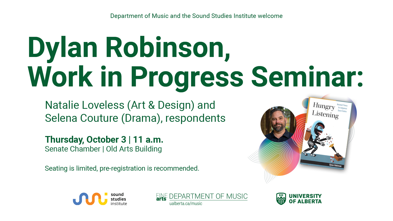 “Dylan Robinson, Work in Progress Seminar. Natalie Loveless (Art & Design) and Selena Couture (Drama), respondents.” | Oct. 3, 11 a.m. - Questions About Music: