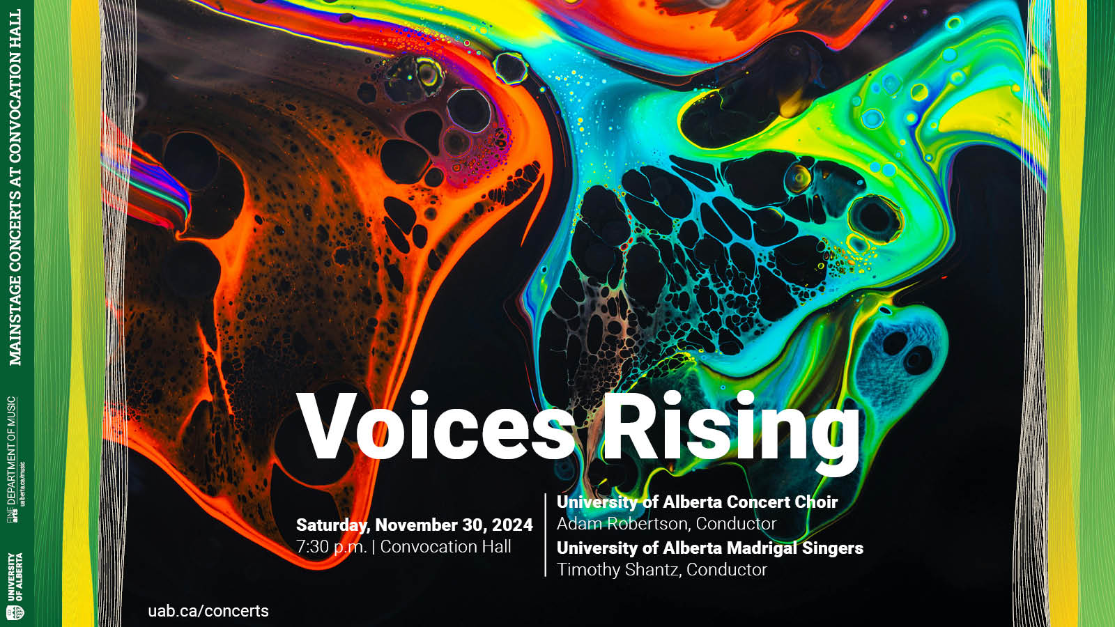 Join the University of Alberta Madrigal Singers and Concert Choir for an evening of music that explores the myriad colours of the human voice. Featuring works by Whitacre, Runestad, Fauré, Stanford, Balfour, Sewepagaham, Gimon, Beatch, Corlis, and more, you’ll be treated to vivid soundscapes that celebrate everything from love and nature to a good pot of chili.