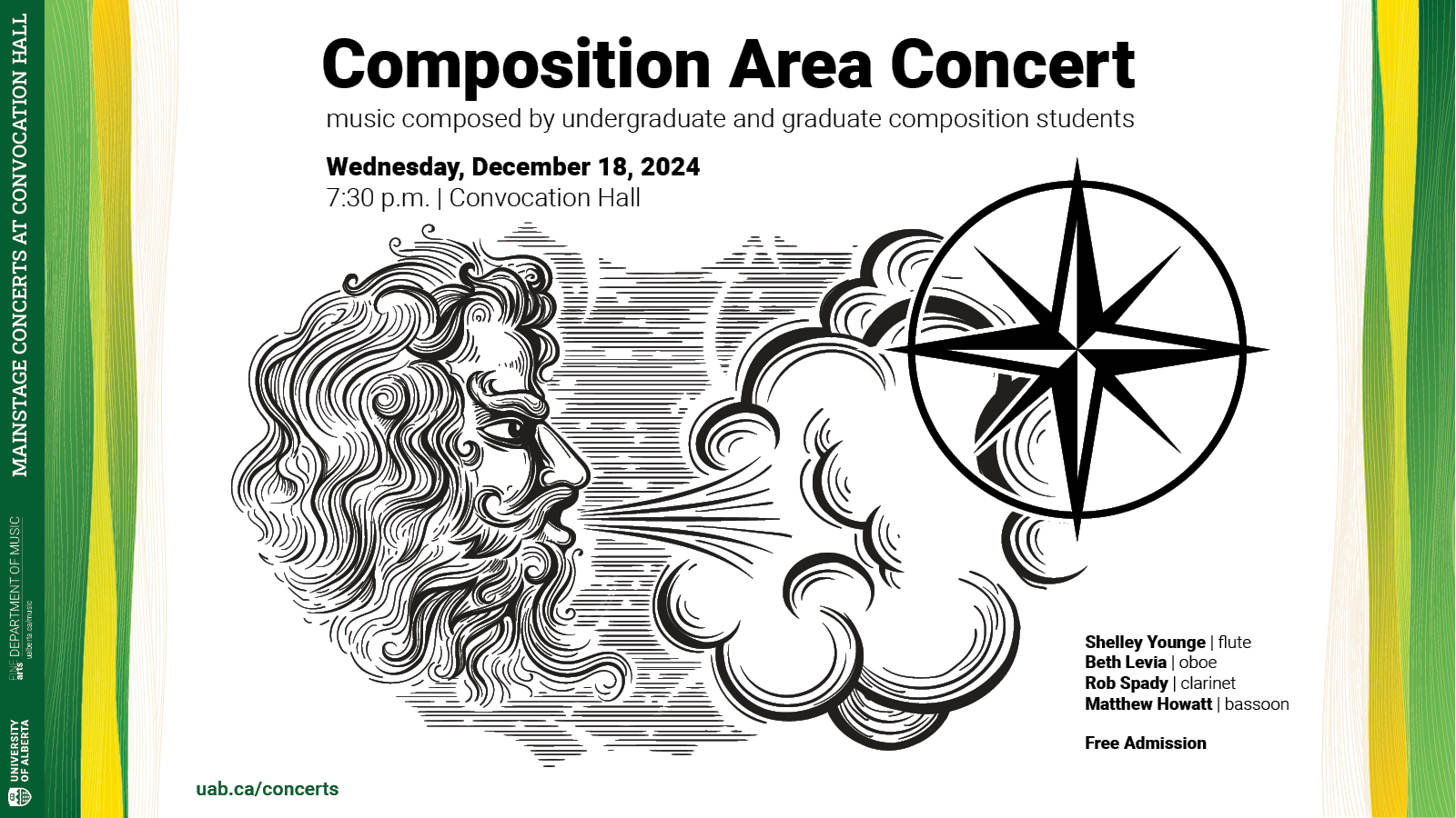 Join the Composition Area for a concert of music composed by undergraduate and graduate composition students. Performed by: Shelley Younge | flute; Beth Levia | oboe; Rob Spady | clarinet; Matthew Howatt | bassoon