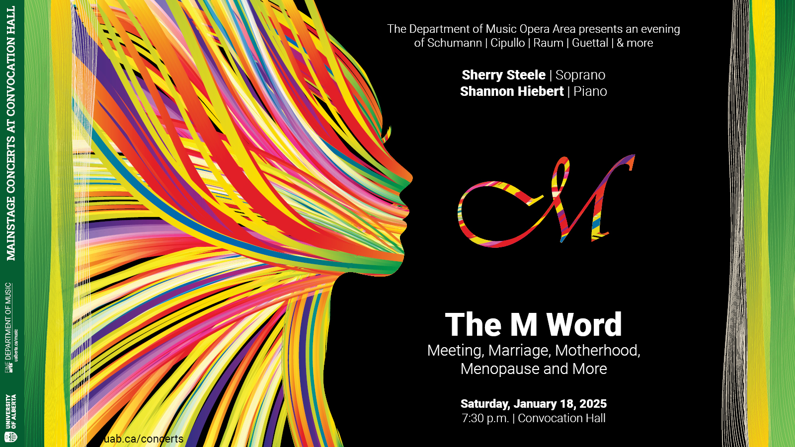 Join the Department of Music Opera Area as they welcome Sherry Steele (soprano) and Shannon Hiebert (piano) for The M Word: Meeting, Marriage, Motherhood, Menopause and More — Performing Schumann's seminal work Frauenlieben und Leben, and then exploring the journey of womanhood through a more modern lens, featuring the works of contemporary composers Cipullo, Raum, Guettal and more.