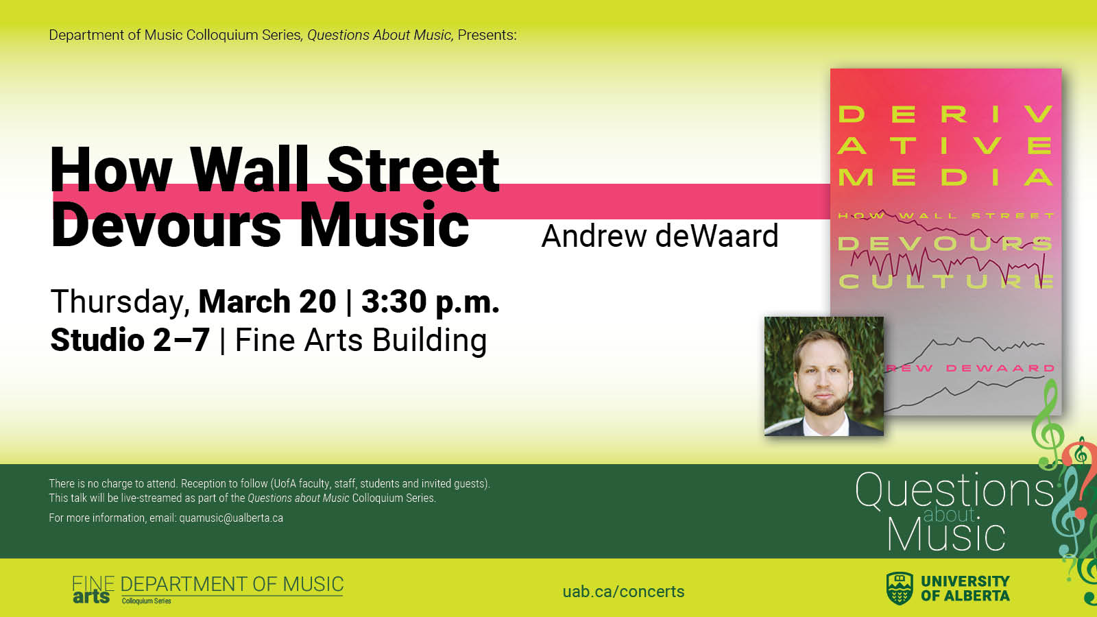 Join Brian Fauteux in a conversation with Andrew deWaard (University of California, San Diego) about Derivative Media: How Wall Street Devours Culture (UC Press, 2024, available open-access). In this book, deWaard shows how the financial sector is dismantling the creative capacity of the music industries by upwardly redistributing wealth, consolidating corporate media, harming creative labor, and restricting our collective media culture. Samples, interpolations, covers, lyrical product placements, songs that remake old songs—does it feel like everything new in music is just derivative of something old? From hedge funds to hip hop, private equity to platformed playola, deWaard connects the dots between Wall Street and our crumbling music culture.