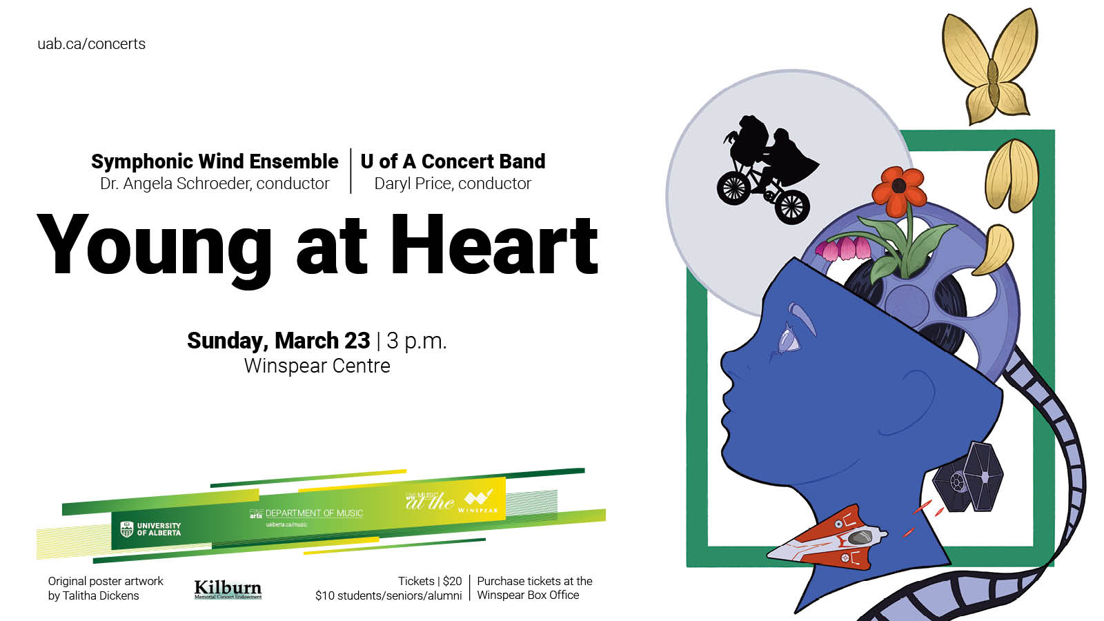 Young at Heart featuring the U of A Symphonic Wind Ensemble and Concert Band (Angela Schroeder and Daryl Price, conductors), fills the Winspear with an afternoon of music influenced by themes of childhood and reminiscence, and a special performance of "A Child's Garden of Dreams" by David Maslanka.