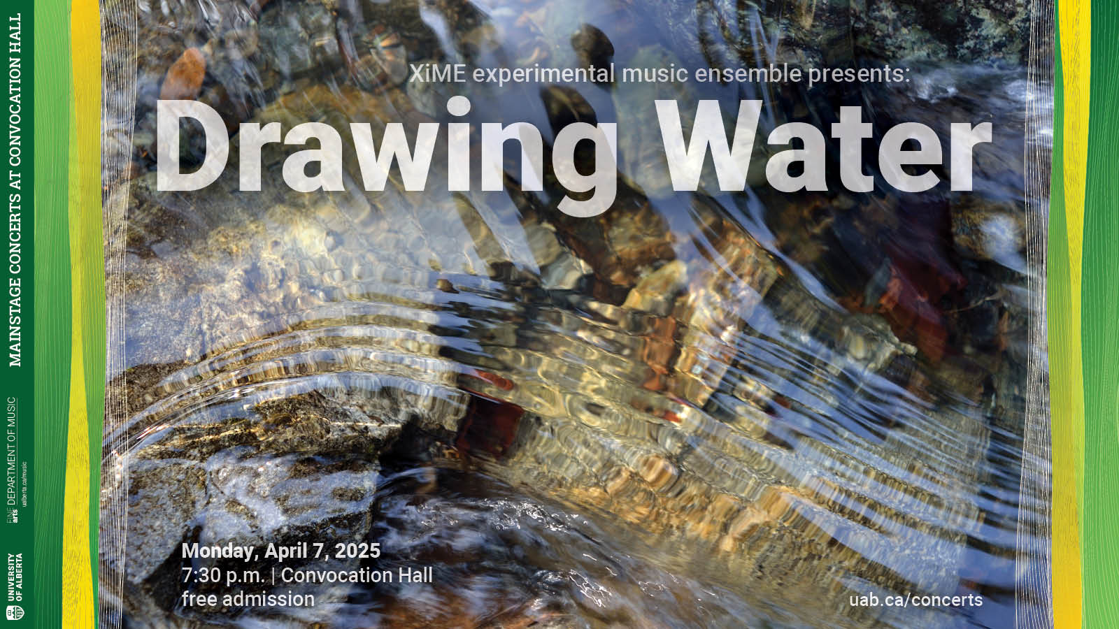 XiME’s final concert, Drawing Water, begins with an improvisatory work developed in SSI/CCE's new recording studio, Sound3 Lab. The concert includes multiple collaborations with Art 340: interpretation of graphic works and live visual interpretation of a XiME improvisation, and XiME will be joined by students from the Drama department for a collaborative improvised work.