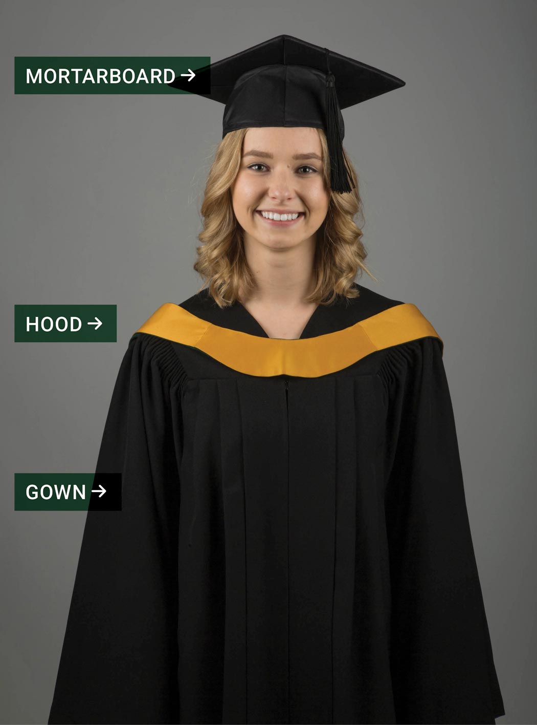 Plan to arrive 30 minutes before your ceremony dressed in your academic apparel, which includes a gown, hood, and mortarboard. Please see the images below for a representation of the appropriate way to wear your apparel.