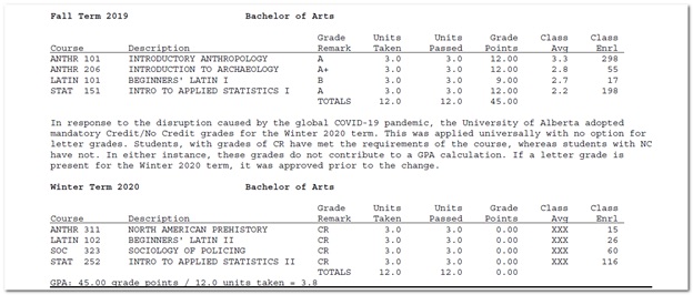 A sample of a transcript including Cr/NC grades as related to Winter 2020 grading is available here.