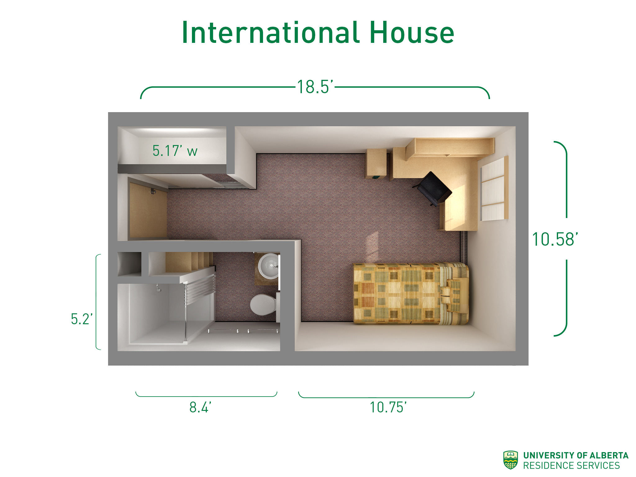 Each room is furnished with a twin (XL) bed, desk, chair, a small fridge, storage and closet space, a recycling bin and garbage can.