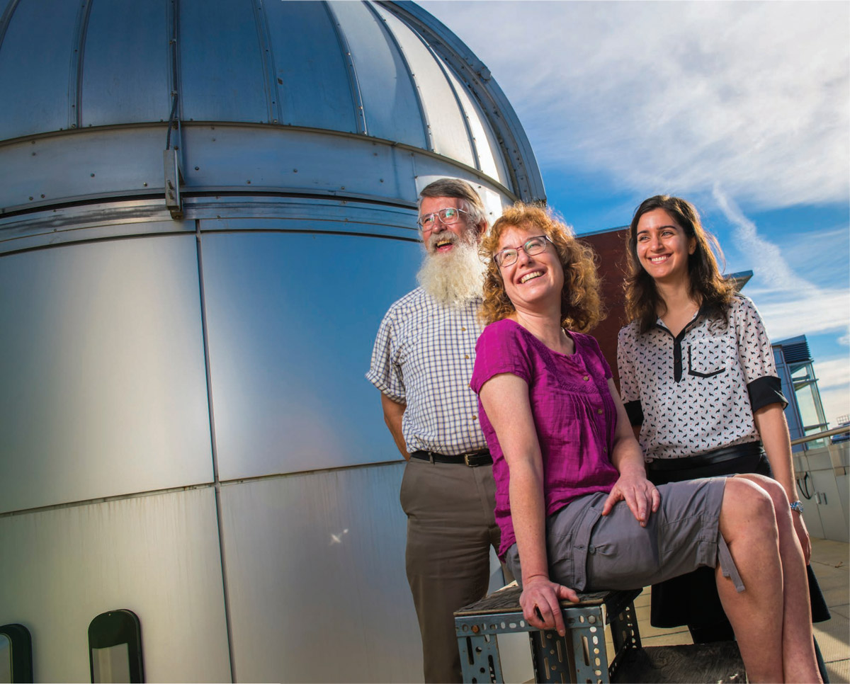 From left, professors Don Page and Sharon Morsink, pictured atop the Department of Physics Observatory with Yasaman Yazdi, the newest Avadh Bhatia post-doctoral fellow.
