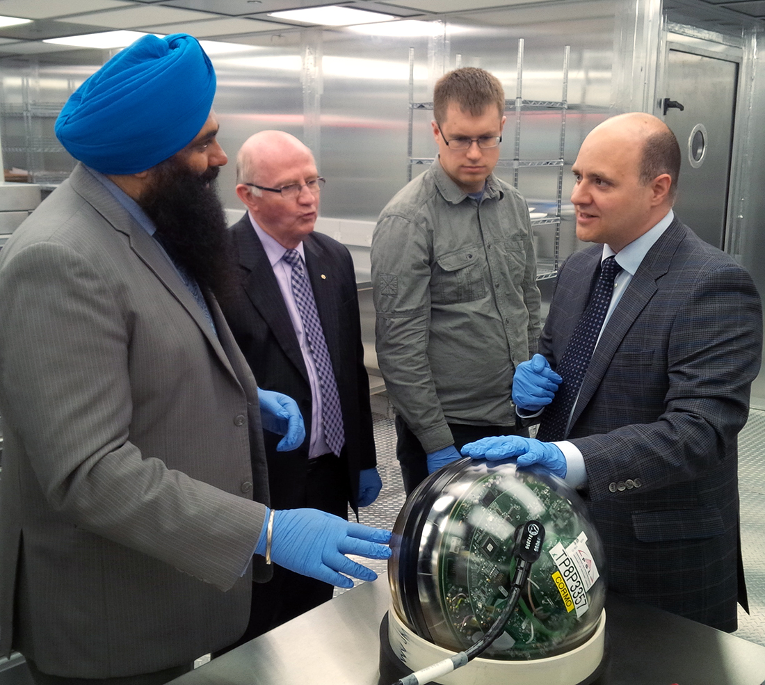 (L to R: The Honourable Tim Uppal, Lorne Babiuk, Zachary Friggstad, Darren Grant) Minister Uppal views one of the IceCube digital optical modules during a tour of Darren Grant's astroparticle physics laboratory in the Centennial Centre for Interdisciplinary Science. More than 5000 of these modules are deployed over a cubic-kilometre in the deep glacier at South Pole Station in Antarctica to study the properties of high energy neutrinos and search for dark matter.