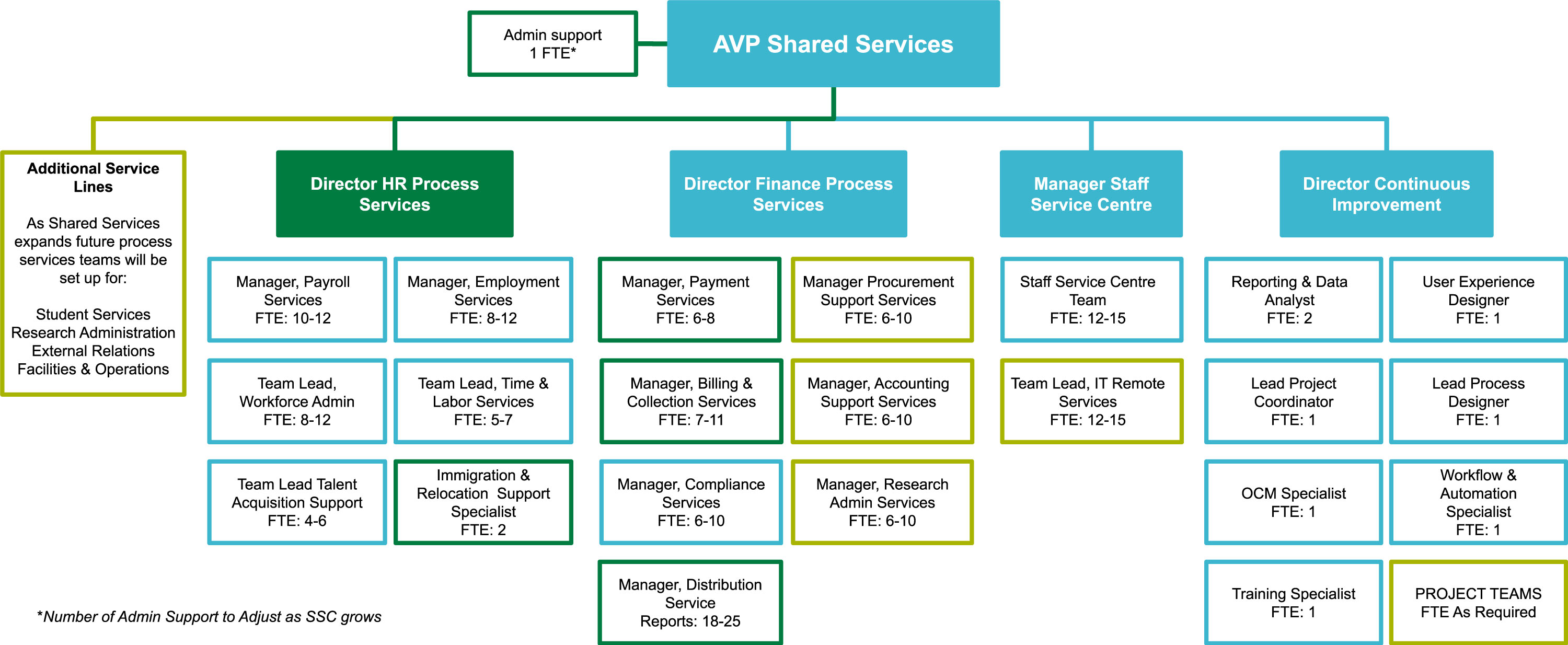 - Admin support — 1 FTE (Number of Admin Support to Adjust as Staff Service Centre grows) (existing position)